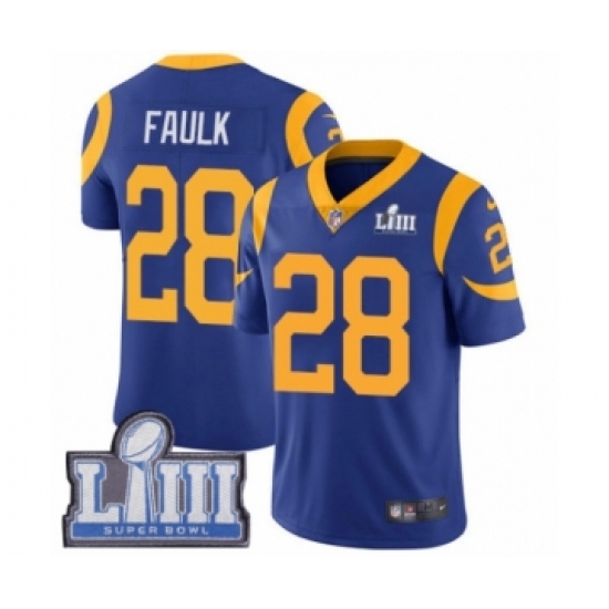>Youth Nike Los Angeles Rams #28 Marshall Faulk Royal Blue Alternate Vapor Untouchable Limited Player Super Bowl LIII Bound NFL Jersey