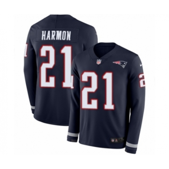 >Youth Nike New England Patriots #21 Duron Harmon Limited Navy Blue Therma Long Sleeve NFL Jersey