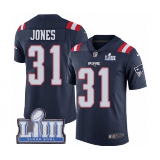 >Youth Nike New England Patriots #31 Jonathan Jones Limited Navy Blue Rush Vapor Untouchable Super Bowl LIII Bound NFL Jersey