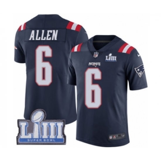 >Youth Nike New England Patriots #6 Ryan Allen Limited Navy Blue Rush Vapor Untouchable Super Bowl LIII Bound NFL Jersey