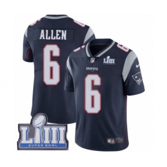>Youth Nike New England Patriots #6 Ryan Allen Navy Blue Team Color Vapor Untouchable Limited Player Super Bowl LIII Bound NFL Jersey