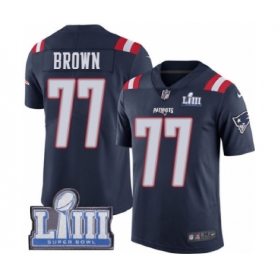 >Youth Nike New England Patriots #77 Trent Brown Limited Navy Blue Rush Vapor Untouchable Super Bowl LIII Bound NFL Jersey