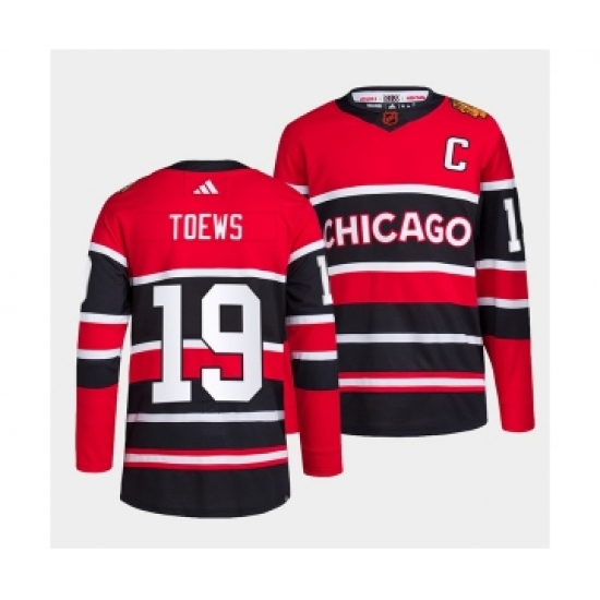 Men's Chicago Blackhawks #19 Jonathan Toews Red Black 2022 Reverse Retro Stitched Jersey