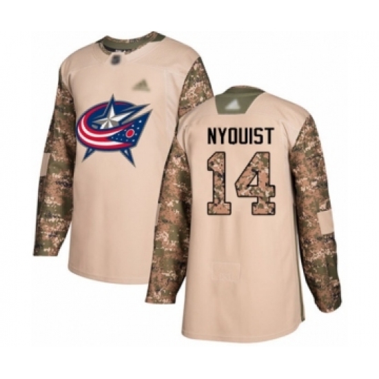 >Men's Columbus Blue Jackets #14 Gustav Nyquist Authentic Camo Veterans Day Practice Hockey Jersey