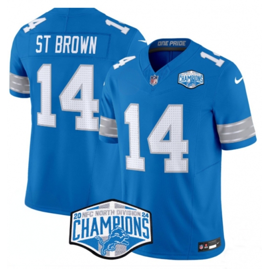 >Men's Detroit Lions #14 Amon-Ra St. Brown Blue 2024 NFC North Champions F.U.S.E. Vapor Limited Stitched Jersey