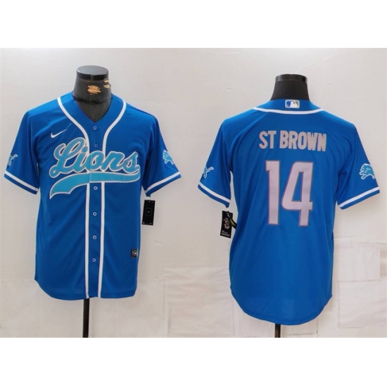 >Men's Detroit Lions #14 Amon-Ra St. Brown Blue Cool Base Stitched Baseball Jersey