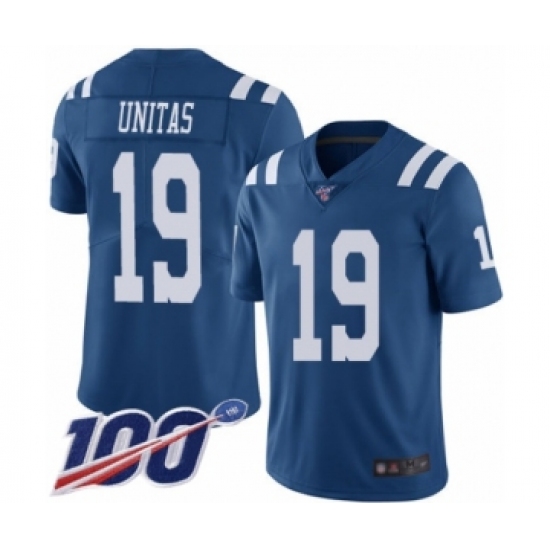 Men's Indianapolis Colts #19 Johnny Unitas Limited Royal Blue Rush Vapor Untouchable 100th Season Football Jersey