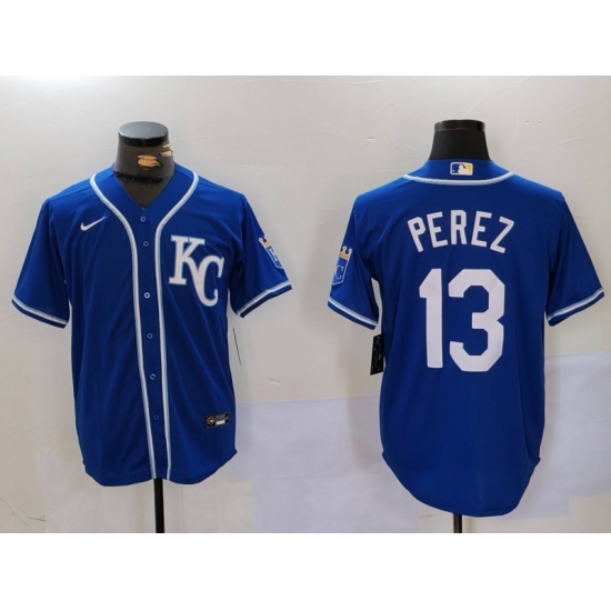 Men's Kansas City Royals #13 Salvador Perez Blue KC Cool Base Stitched Jersey