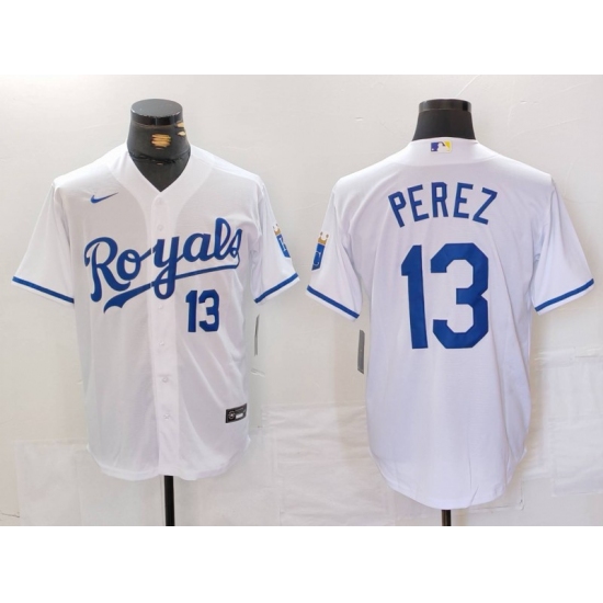 Men's Kansas City Royals #13 Salvador Perez Number White Cool Base Stitched Jersey