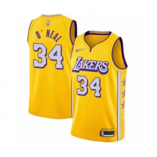 >Men's Los Angeles Lakers #34 Shaquille O'Neal Swingman Gold 2019-20 City Edition Basketball Jersey