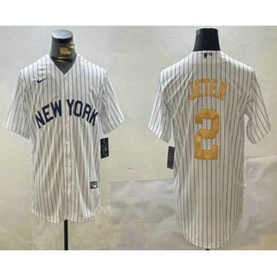 >Men's New York Yankees #2 Derek Jeter White Pinstripe Name Fashion Cool Base Jersey