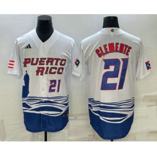 >Mens Puerto Rico Baseball #21 Roberto Clemente Number 2023 White World Baseball Classic Stitched Jersey