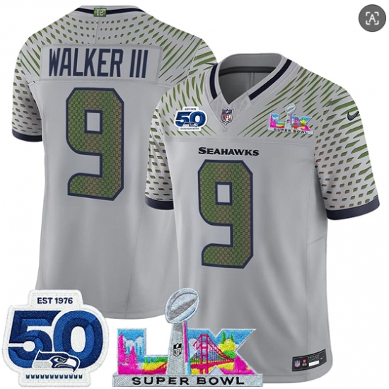 Men's Seattle Seahawks #9 Kenneth Walker III Gray 2025 F.U.S.E. Super Bowl LX And 50th Season“Rivalries” Vapor Limited Football Stitched Jersey