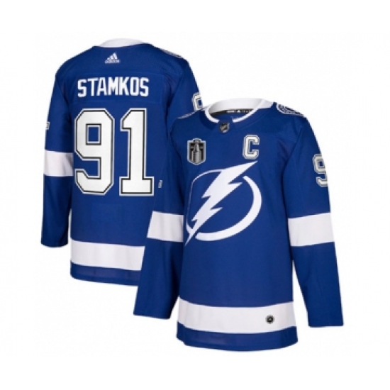 Men's Tampa Bay Lightning #91 Steven Stamkos 2022 Blue Stanley Cup Final Patch Stitched Jersey