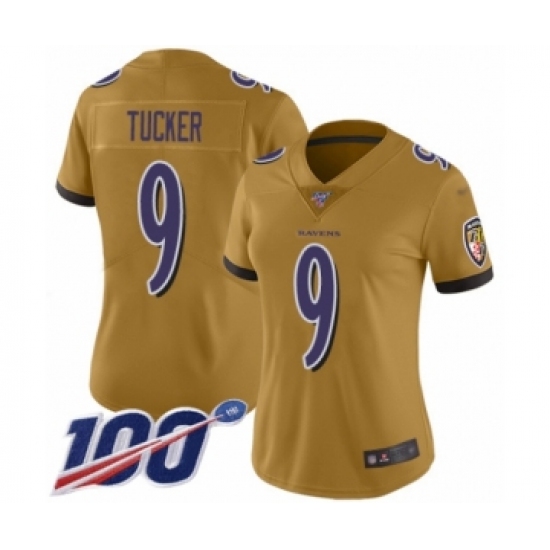 >Women's Baltimore Ravens #9 Justin Tucker Limited Gold Inverted Legend 100th Season Football Jersey