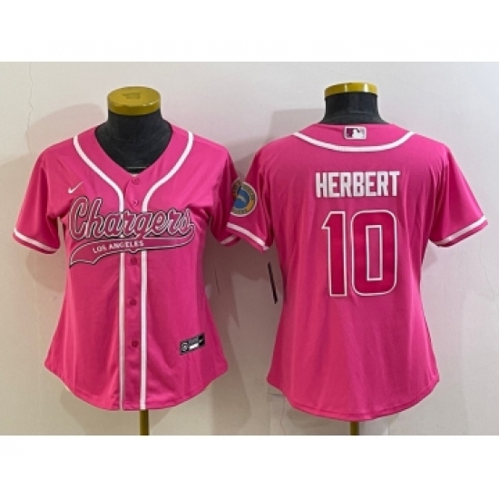 >Women's Los Angeles Chargers #10 Justin Herbert Pink With Patch Cool Base Stitched Baseball Jersey
