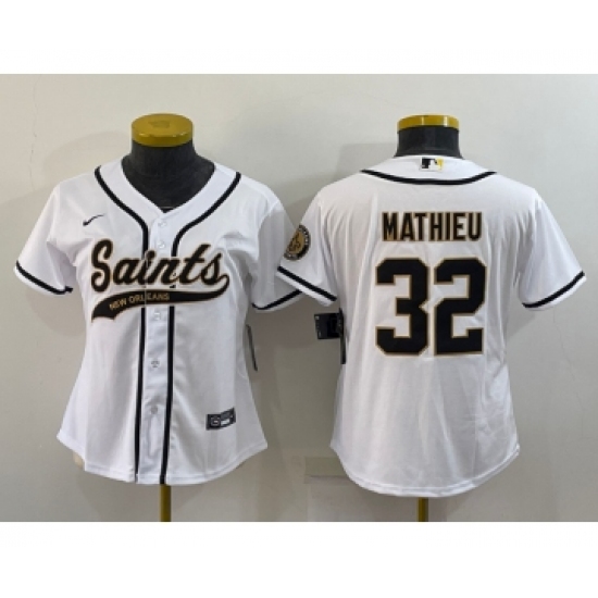 >Women's New Orleans Saints #32 Tyrann Mathieu White With Patch Cool Base Stitched Baseball Jersey