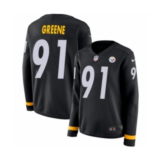 >Women's Nike Pittsburgh Steelers #91 Kevin Greene Limited Black Therma Long Sleeve NFL Jersey