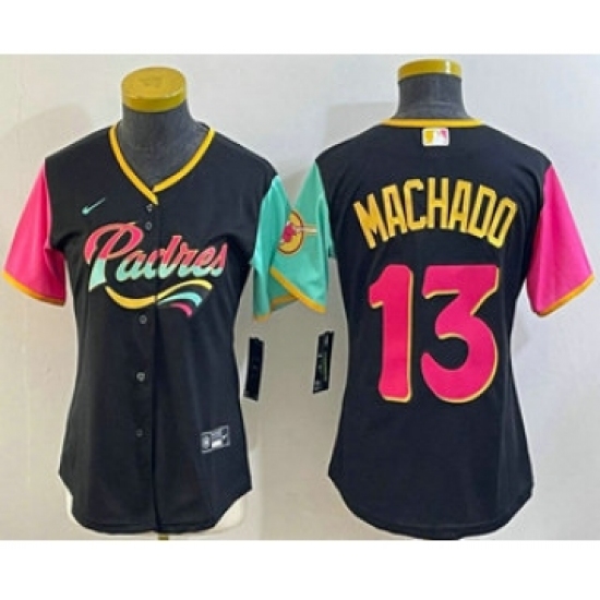 >Women's San Diego Padres #13 Manny Machado Black 2022 City Connect Cool Base Stitched Jersey