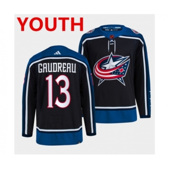 >Youth Columbus Blue Jackets #13 Johnny Gaudreau Navy 2022 Reverse Retro Stitched Jersey
