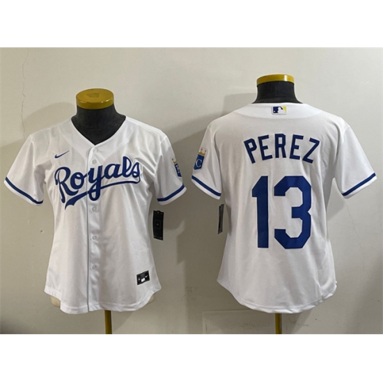 >Youth Kansas City Royals #13 Salvador Perez White Cool Base Stitched Baseball Jersey