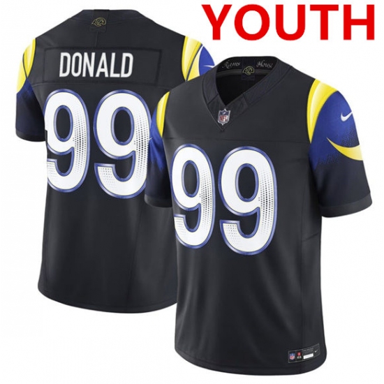 >Youth los angeles rams #99 aaron donald midnight blue 2025 f.u.s.e. “rivalries” vapor limited football stitched jersey
